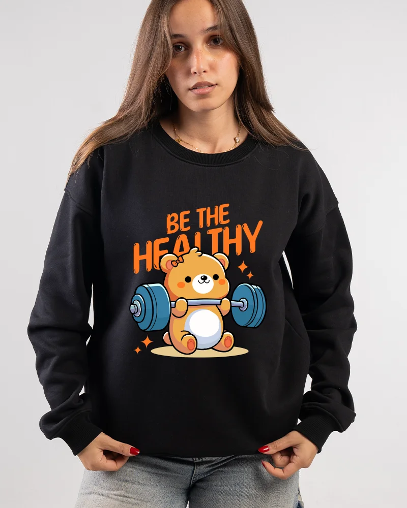 Add energy and positivity to your everyday look with the Be The Healthy Sport Sweatshirt from TShack. This soft black crewneck comes with cute bear lifting weights, giving you a fun and sporty vibe that fits any casual or active outfit.