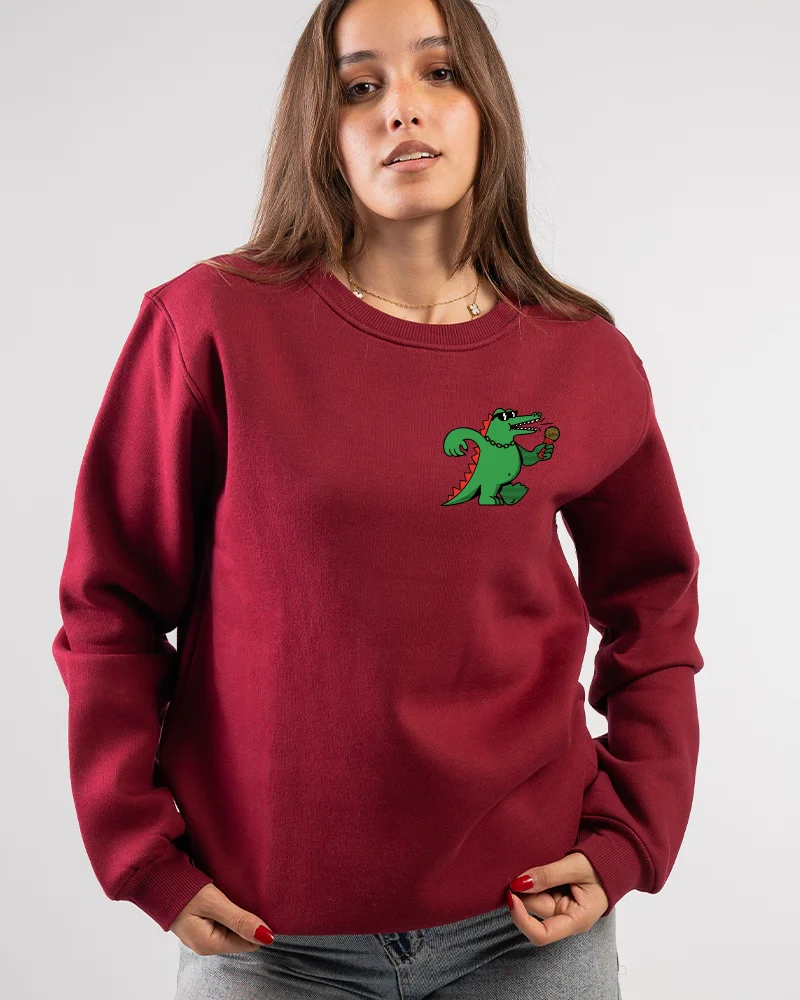 A black unisex sweatshirt featuring a fun cartoon crocodile holding a microphone. Soft fabric, vibrant print, and a playful minimalist design.