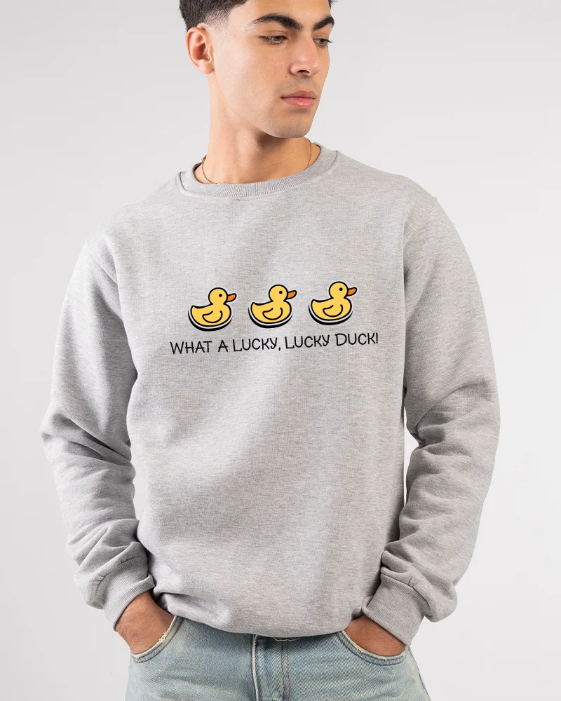 Bring a splash of charming luck to your wardrobe with this Charming Lucky Duck Sweatshirt. This comfortable crewneck features a delightful graphic of three small, bright yellow cartoon ducks and the cheerful quote: “WHAT A LUCKY, LUCKY DUCK!” printed across the chest. This Lucky Duck Sweatshirt is the perfect light-hearted piece for anyone who appreciates fun, simple designs, and a touch of positive humor. The contrast of the bright yellow ducks against the classic fabric makes the design instantly pop.
