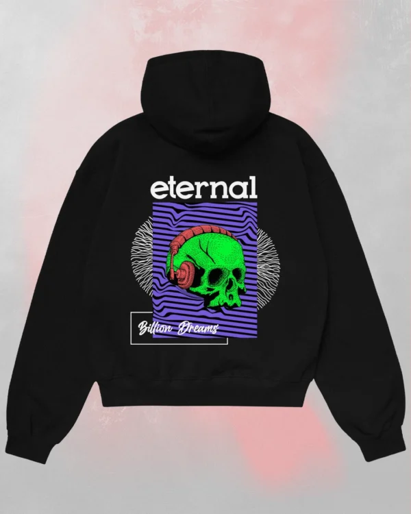 The back features a neon green skull with purple glitch waves, creating a strong cyber–streetwear vibe, while the front showcases a clean “Eternal Billion Dreams” graphic that complements the look perfectly. Made from a soft, durable cotton blend, this hoodie delivers comfort, style, and long-lasting print quality.