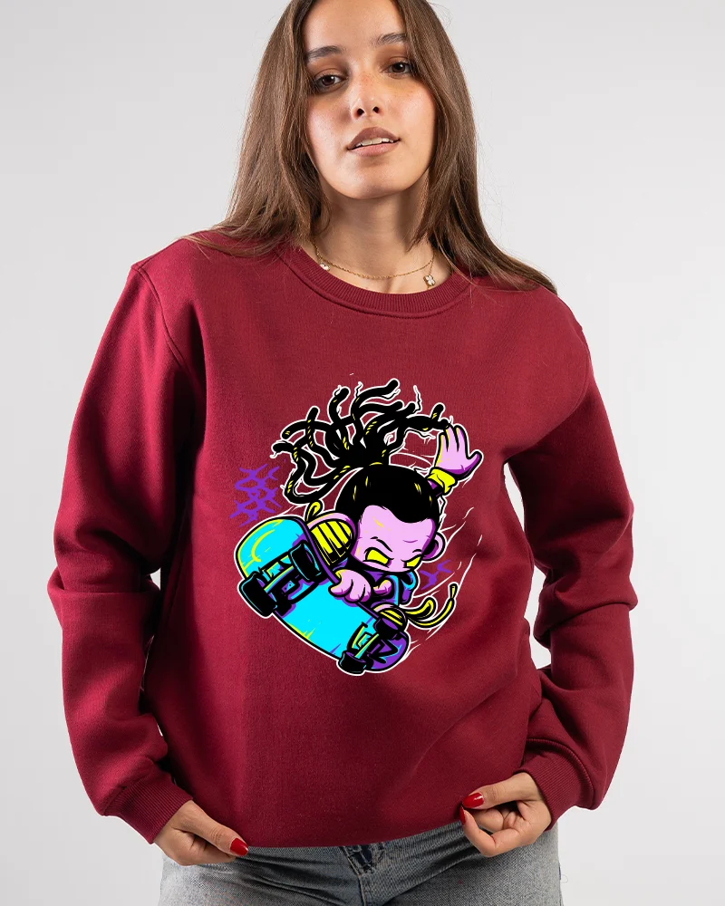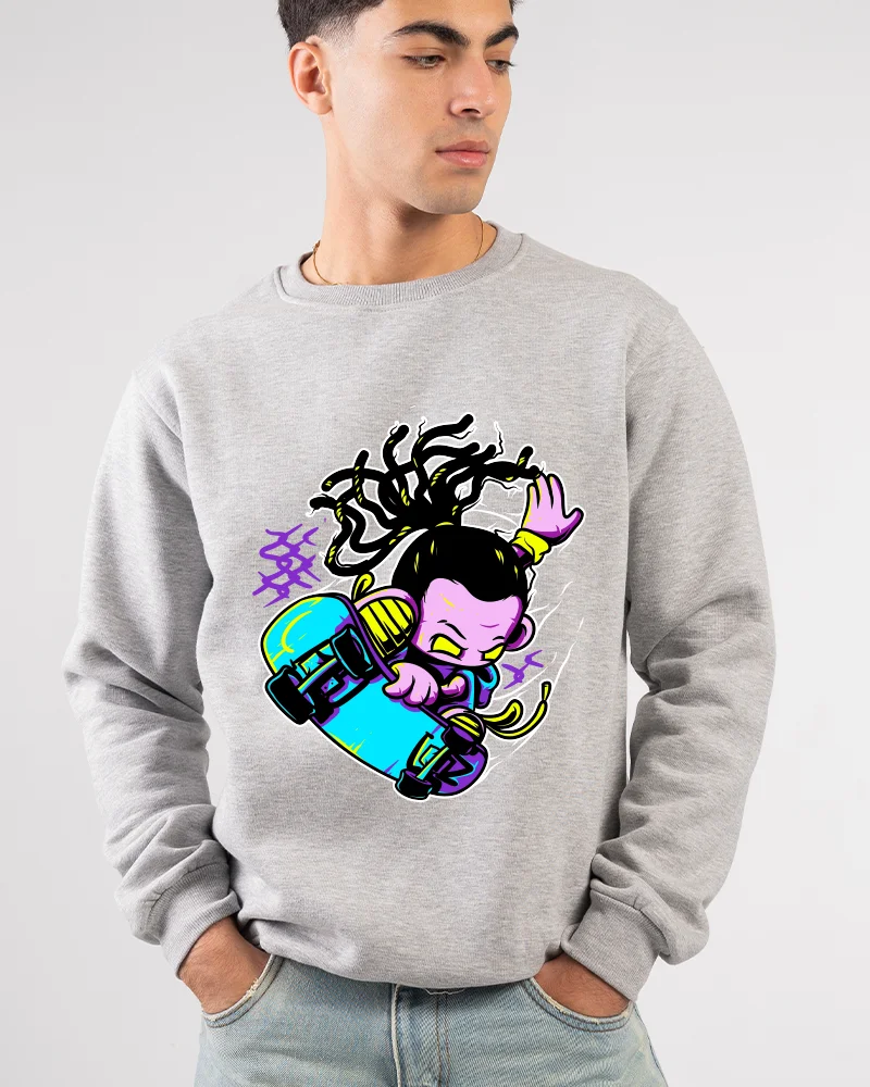 100% Cotton fabrics for a bold unisex sweatshirt featuring a neon cartoon skater in vibrant colors. Classic round neckline with ribbed cuffs, soft fabric, expressive streetwear style, and premium printing.