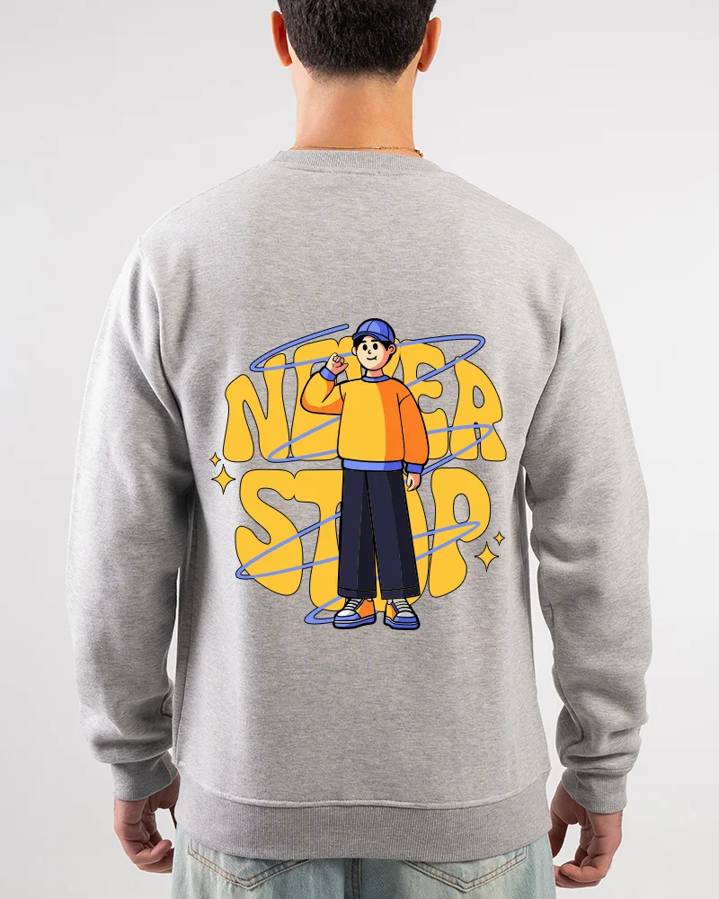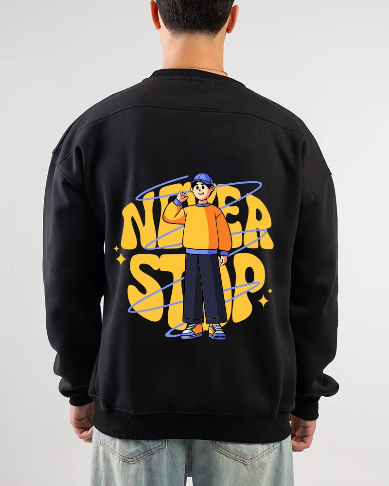 Stay motivated and confident with TShack’s Never Stop printed sweatshirt. Designed with a clean cartoon illustration and bold “Never Stop” typography, this black crewneck sweatshirt delivers positive energy with a fun, modern touch. The playful character graphic adds charm while keeping the look minimal and easy to style.