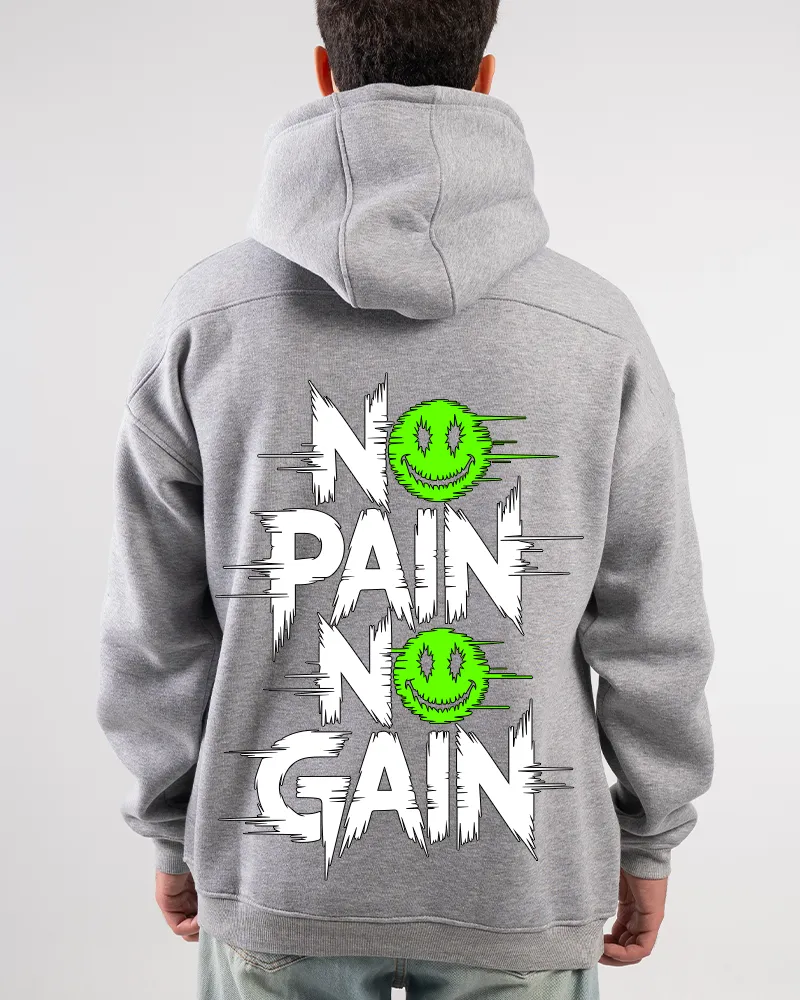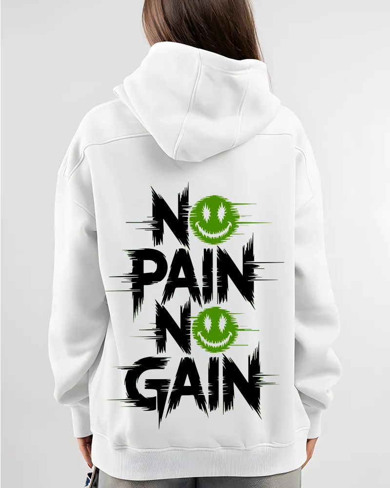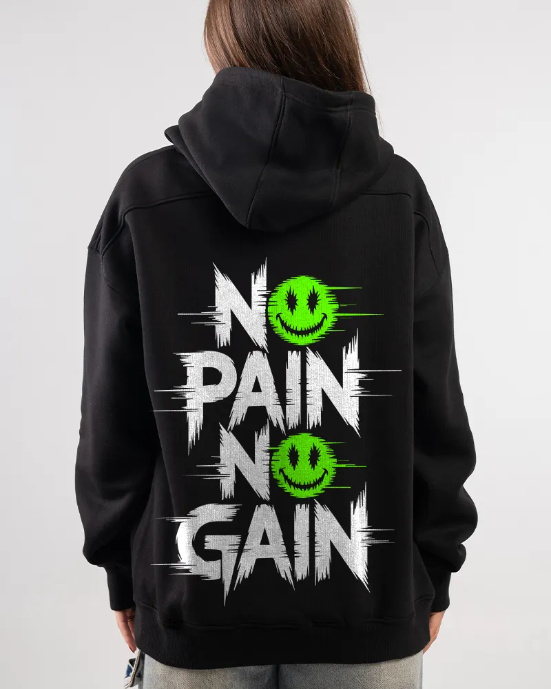 The No Pain No Gain Hoodie delivers effortless comfort with a bold edge. Made from a soft cotton blend, it features a front text print and a relaxed unisex fit — perfect for everyday wear with a sporty attitude.