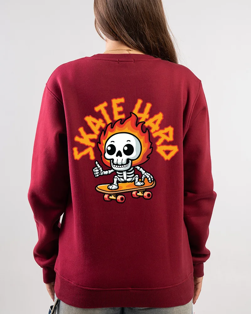 Bold, fun, and full of streetwear attitude — this Skate Hard printed sweatshirt features a flaming cartoon skeleton on a skateboard. Soft, comfortable, and perfect for casual everyday outfits.